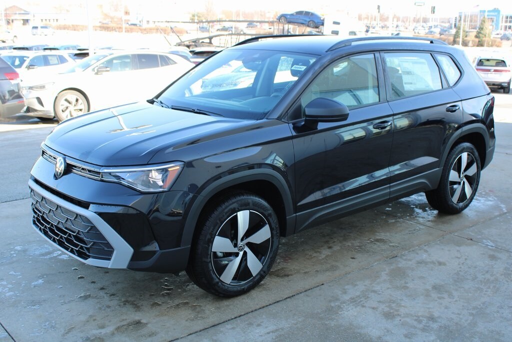 Recent Arrival! Deep Black Pearl 2025 Volkswagen Taos 4D Sport Utility 1.5T S 1.5L I4 Turbocharged DOHC 16V LEV3-SULEV30 174hp 25/33 City/Highway MPG 8-Speed Automatic with Tiptronic AWD